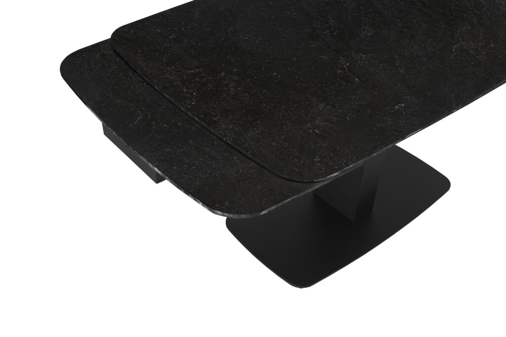 Керамічна стільниця чорного матового кольору додає розкоші та сучасного характеру, водночас вона стійка до подряпин, вологи й високих температур. Міцна металева основа гарантує стабільність і довговічність, створюючи виразний акцент у вашому інтер’єрі.